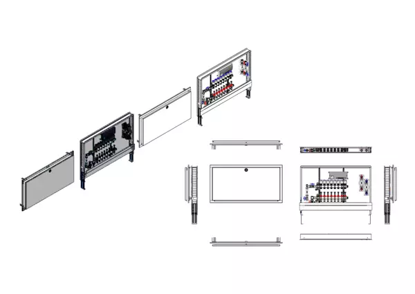 vertikale Anschlussgarnitur mit Wärmezählerverohrung, Verteiler mit Durchflussanzeiger 0-3 l/min im Vorlaufbalken und Thermostatventileinsatz M30x1,5 im Rücklaufbalken, vormontierte Stellantriebe und Klemmleiste mit Vorverdrahtung, Wasserzählerstrecken Trinkwasser kalt und warm, Standard-Unterputz-Schrank mit Frontblende RAL 9016