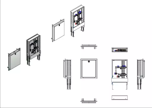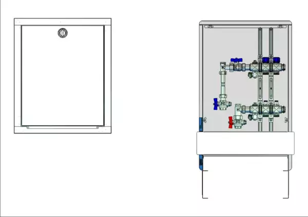 Die Anschlussstation für Flächenheizung und -kühlung ist im Unterputzschrank montiert und umfasst einen Edelstahlverteiler mit integrierten Regulierventilen und Ventileinsätzen (M30x1,5), sowie eine vertikale Anschlussgarnitur mit Wärmezählerverrohrung. Es gibt Platzhaltungen für eine Klemmleiste und Stellantriebe.