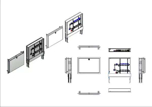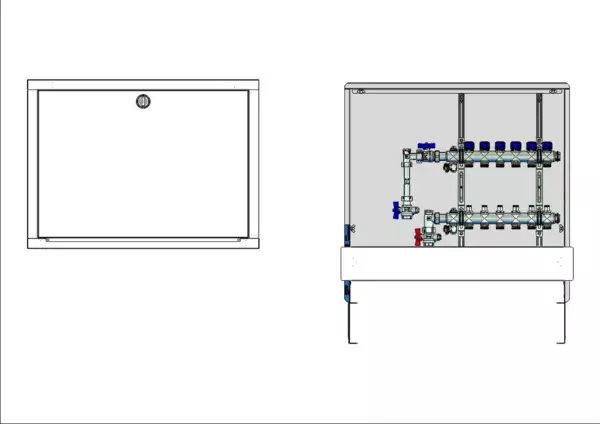 strawa FB-Anschlussstation H 53-WMZ 6 Hkr.,BxHxT: 750x725x122 mm, vert. AG m. WMZ, Verteiler mit Regulierventil + THV M30x1,5, Standard-UP-Schrank mit Frontblende in RAL 9016
