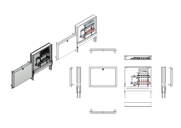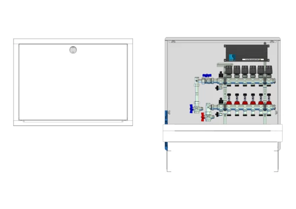 vertikale Anschlussgarnitur mit Wärmezählerverohrung, Verteiler mit Durchflussanzeiger 0-3 l/min im Vorlaufbalken und Thermostatventileinsatz M30x1,5 im Rücklaufbalken, vormontierte Stellantriebe und Klemmleiste mit Vorverdrahtung, Standard-Unterputz-Schrank mit Frontblende in RAL 9016