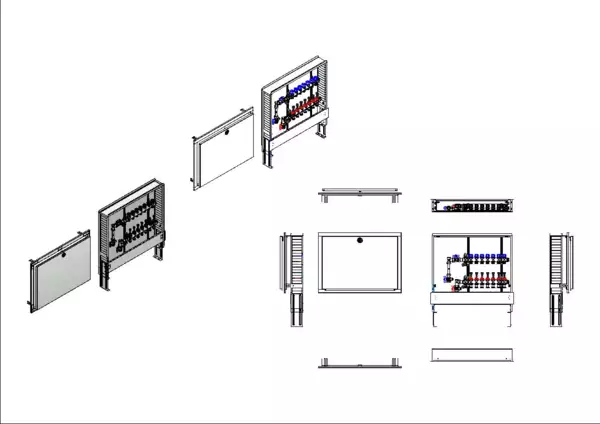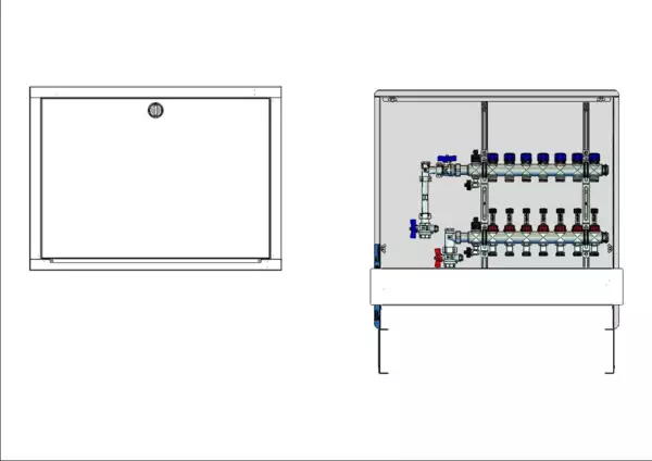 strawa FB-Anschlussstation H 63-WMZ 7 Hkr.,BxHxT: 750x725x122 mm, vert. AG. m. WMZ, Verteiler mit DFA 0-3 l/min + THV M30x1,5, Standard-UP-Schrank mit Frontblende in RAL 9016