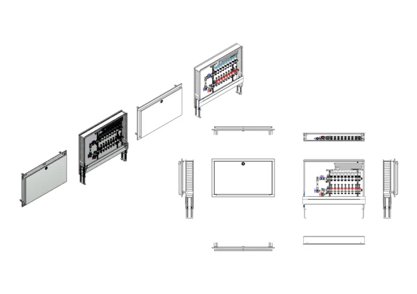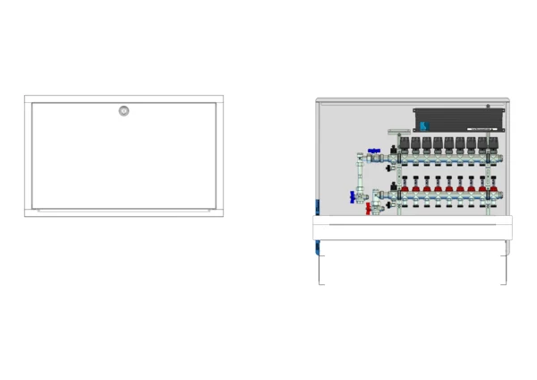 vertikale Anschlussgarnitur mit Wärmezählerverohrung, Verteiler mit Durchflussanzeiger 0-3 l/min im Vorlaufbalken und Thermostatventileinsatz M30x1,5 im Rücklaufbalken, vormontierte Stellantriebe und Klemmleiste mit Vorverdrahtung, Standard-Unterputz-Schrank mit Frontblende in RAL 9016