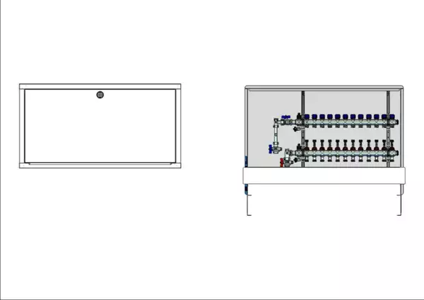 strawa FB-Anschlussstation H 63-WMZ 12 Hkr.,BxHxT: 1050x725x122 mm, vert. AG. m. WMZ, Verteiler mit DFA 0-3 l/min + THV M30x1,5, Standard-UP-Schrank mit Frontblende in RAL 9016