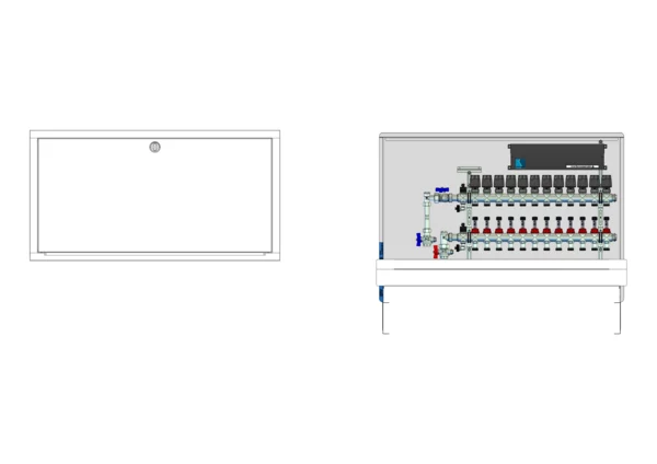 vertikale Anschlussgarnitur mit Wärmezählerverohrung, Verteiler mit Durchflussanzeiger 0-3 l/min im Vorlaufbalken und Thermostatventileinsatz M30x1,5 im Rücklaufbalken, vormontierte Stellantriebe und Klemmleiste mit Vorverdrahtung, Standard-Unterputz-Schrank mit Frontblende in RAL 9016