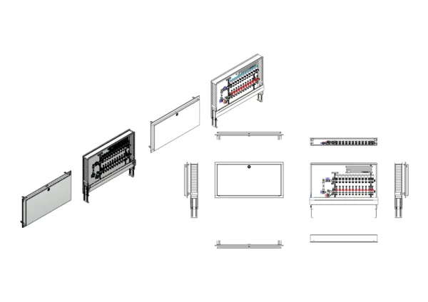 Die Anschlussstation für Flächenheizung ist im Unterputz-Schrank montiert und umfasst einen Edelstahlverteiler mit regulierbaren Durchflussanzeigern und Ventileinsätzen (M30×1,5) sowie eine vertikale Anschlussgarnitur mit Wärmezählerverrohrung. Die vormontierten und verdrahteten Stellantriebe sind auf einer montierten Klemmleiste installiert.