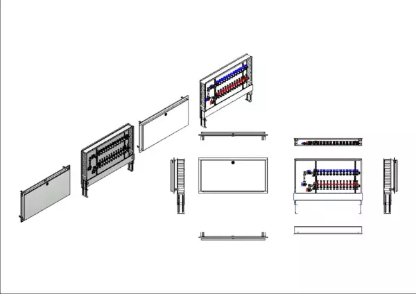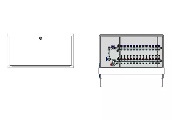 strawa FB-Anschlussstation H 63-WMZ 13 Hkr.,BxHxT: 1050x725x122 mm, vert. AG. m. WMZ, Verteiler mit DFA 0-3 l/min + THV M30x1,5, Standard-UP-Schrank mit Frontblende in RAL 9016