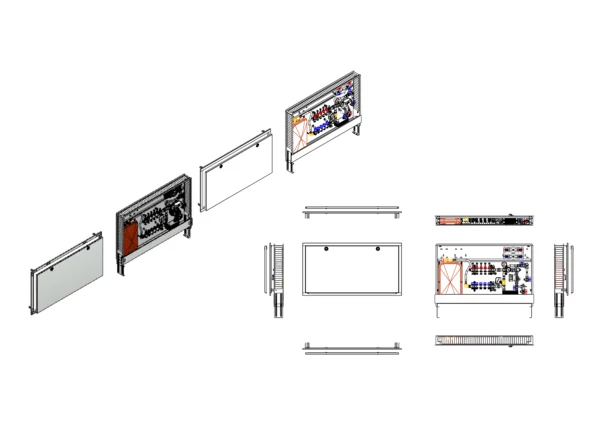 Die Mischstation für Flächenheizung ist mit einer Systemtrennung und einer witterungsgeführten Vorlauf-Temperaturregelung (Regler nicht im Lieferumfang) ausgestattet. Die im Unterputzschrank montierte Mischgruppe umfasst eine Umwälzpumpe, einen Edelstahlverteiler mit regulierbaren Durchflussanzeigern und Ventileinsätzen (M30x1,5), sowie eine vertikale Anschlussgarnitur mit Wärmezählerverrohrung. Zusätzlich sind Wasserzählereinbaustrecken für Trinkwasser kalt und warm vorhanden. Es gibt Platzhaltungen für eine Klemmleiste und Stellantriebe.