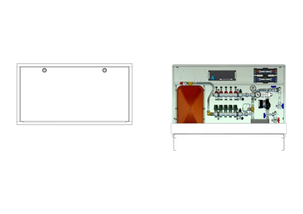Die Mischstation für Flächenheizung ist mit einer Systemtrennung und einer witterungsgeführten Vorlauf-Temperaturregelung (Regler nicht im Lieferumfang) ausgestattet. Die im Unterputzschrank montierte Mischgruppe umfasst eine Umwälzpumpe, einen Edelstahlverteiler mit regulierbaren Durchflussanzeigern und Ventileinsätzen (M30x1,5), sowie eine vertikale Anschlussgarnitur mit Wärmezählerverrohrung. Zusätzlich sind Wasserzählereinbaustrecken für Trinkwasser kalt und warm vorhanden. Die vormontierten und verdrahteten Stellantriebe sind auf einer montierten Klemmleiste installiert.