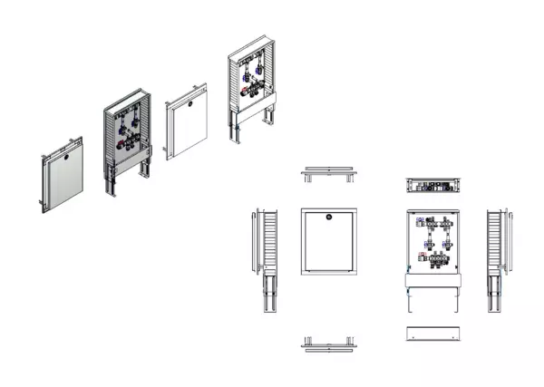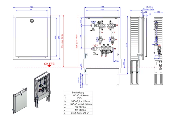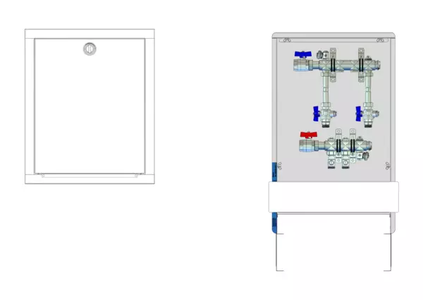 strawa Wohnungsanschlussstation WA 2/1 WMZ,BxHxT: 460x725x122 mm, horiz. AG, 2x Wärmezählerverrohrung 3/4" 110 mm, KH mit Fühleranschluss 5-5,2 im RL und Fühleranschluss 5-5,2 und Minikugelhahn im VL, im Standard-UP-Schrank RAL 9016