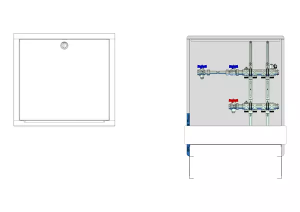 horizontale Anschlussgarnitur mit Wärmezählerverrohrung, Verteiler ohne Einbauten, Standard-Unterputz-Schrank mit Frontblende in RAL 9016
