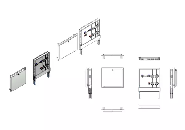 Die Anschlussstation für Heizkörperanbindungen ist im Unterputzschrank montiert und umfasst einen Edelstahlverteiler ohne zusätzliche Einbauten im Heizkreis, sowie eine horizontale Anschlussgarnitur mit Wärmezählerverrohrung.