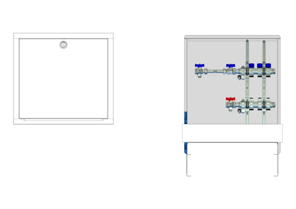strawa FB-Anschlussstation H 53h-WMZ 3 Hkr.,BxHxT: 600x725x92 mm, horiz. AG m. WMZ, Verteiler mit Regulierventil + THV M30x1,5, Standard-UP-Schrank mit Frontblende in RAL 9016