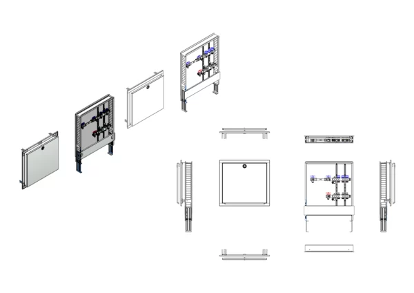 horizontale Anschlussgarnitur mit Wärmezählerverrohrung. Platzhaltung für Klemmleiste und Stellantriebe.