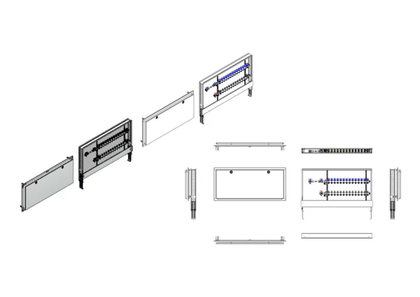 horizontale Anschlussgarnitur mit Wärmezählerverrohrung, Verteiler mit Regulierventilen im Vorlaufbalken und Thermostatventileinsätzen M30x1,5 im Rücklaufbalken, Standard-Unterputz-Schrank mit Frontblende in RAL 9016