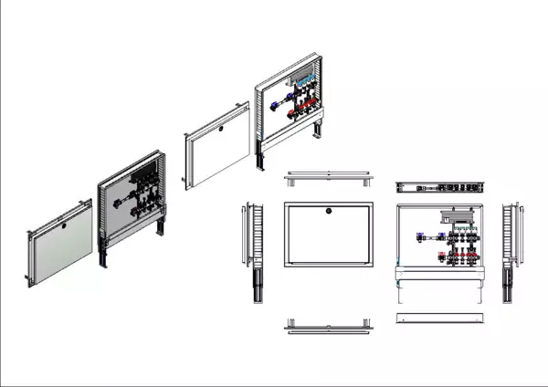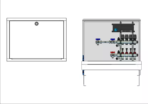 Die Anschlussstation für Flächenheizung ist im Unterputzschrank montiert und umfasst einen Edelstahlverteiler mit regulierbaren Durchflussanzeigern und Ventileinsätzen (M30x1,5), sowie eine horizontale Anschlussgarnitur mit Wärmezählerverrohrung.