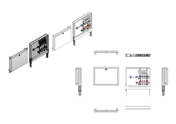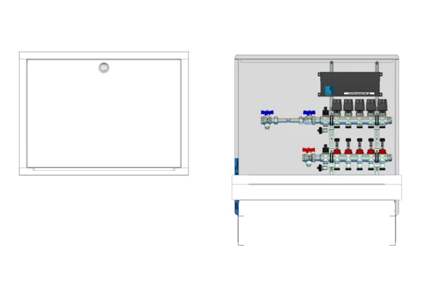strawa FB-Anschlussstation H 63h-WMZ-X 5 Hkr.,BxHxT: 750x725x92 mm, horiz. AG. m. WMZ, Verteiler mit DFA 0-3 l/min + THV M30x1,5, m. vorm. Stellantrieb. und Klemmleiste m. Vorverdraht., Standard-UP-Schrank mit Frontblende in RAL 9016