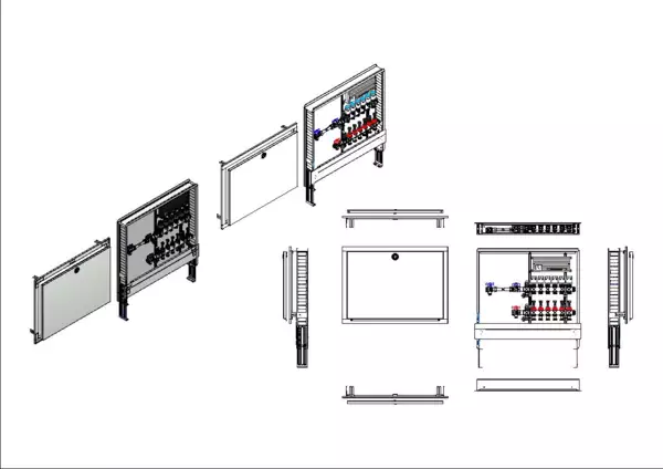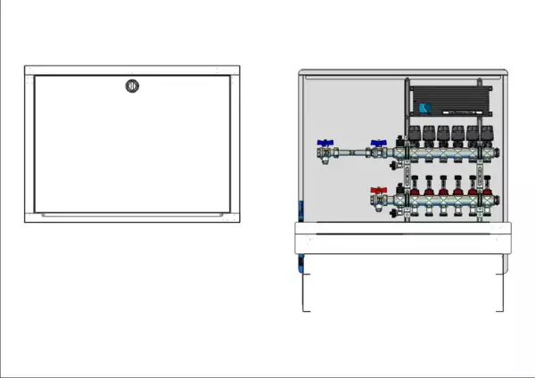 Die Anschlussstation für Flächenheizung ist im Unterputzschrank montiert und umfasst einen Edelstahlverteiler mit regulierbaren Durchflussanzeigern und Ventileinsätzen (M30x1,5), sowie eine horizontale Anschlussgarnitur mit Wärmezählerverrohrung.