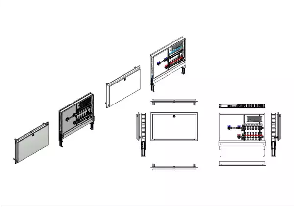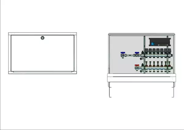 strawa FB-Anschlussstation H 63h-WMZ-X 7 Hkr.,BxHxT: 900x725x92 mm, horiz. AG. m. WMZ, Verteiler mit DFA 0-3 l/min + THV M30x1,5, m. vorm. Stellantrieb. und Klemmleiste m. Vorverdraht., Standard-UP-Schrank mit Frontblende in RAL 9016
