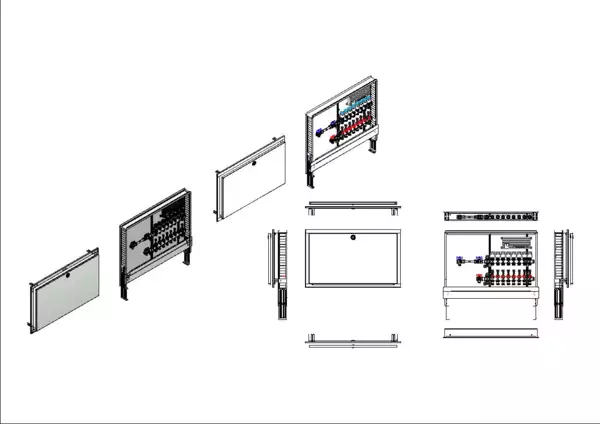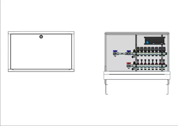 Die Anschlussstation für Flächenheizung ist im Unterputzschrank montiert und umfasst einen Edelstahlverteiler mit regulierbaren Durchflussanzeigern und Ventileinsätzen (M30x1,5), sowie eine horizontale Anschlussgarnitur mit Wärmezählerverrohrung.