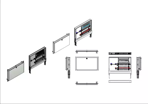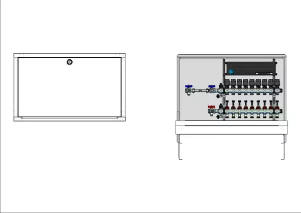Die Anschlussstation für Flächenheizung ist im Unterputzschrank montiert und umfasst einen Edelstahlverteiler mit regulierbaren Durchflussanzeigern und Ventileinsätzen (M30x1,5), sowie eine horizontale Anschlussgarnitur mit Wärmezählerverrohrung.