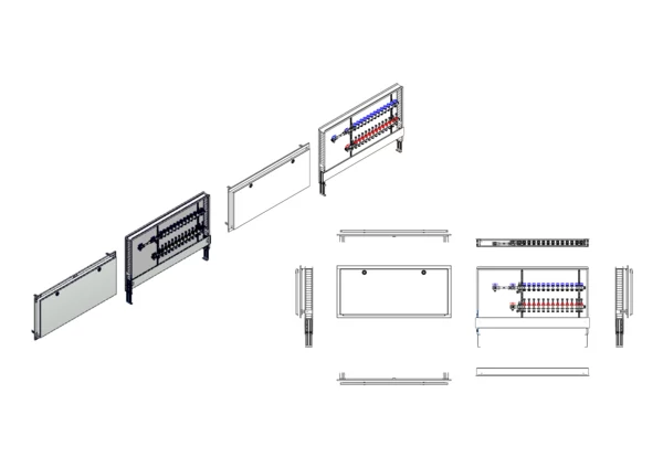 Die Anschlussstation für Flächenheizung und -kühlung ist im Unterputzschrank montiert und umfasst einen Edelstahlverteiler mit regulierbaren Durchflussanzeigern und Ventileinsätzen (M30x1,5), sowie eine horizontale Anschlussgarnitur mit Wärmezählerverrohrung. Es gibt Platzhaltungen für eine Klemmleiste und Stellantriebe.