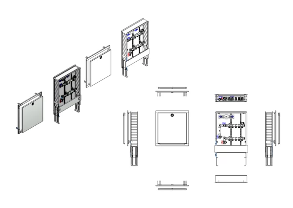 Die Anschlussstation für Heizkörperanbindungen ist im Unterputzschrank montiert und umfasst einen Edelstahlverteiler ohne zusätzliche Einbauten im Heizkreis, sowie eine vertikale Anschlussgarnitur mit Wärmezählerverrohrung. Zusätzlich ist eine Wasserzählereinbaustrecke für Trinkwasser kalt vorhanden.