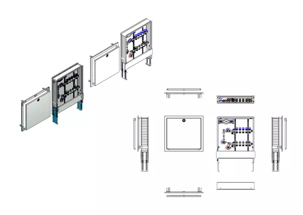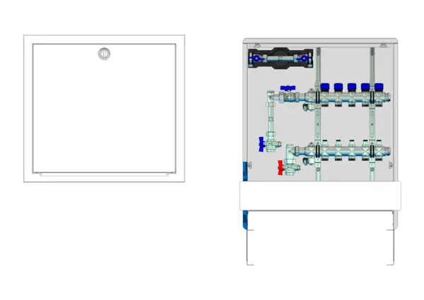 Die Anschlussstation für Flächenheizung und -kühlung ist im Unterputzschrank montiert und umfasst einen Edelstahlverteiler mit integrierten Regulierventilen und Ventileinsätzen (M30x1,5), sowie eine vertikale Anschlussgarnitur mit Wärmezählerverrohrung. Zusätzlich ist eine Wasserzählereinbaustrecke für Trinkwasser kalt vorhanden. Es gibt Platzhaltungen für Stellantriebe.