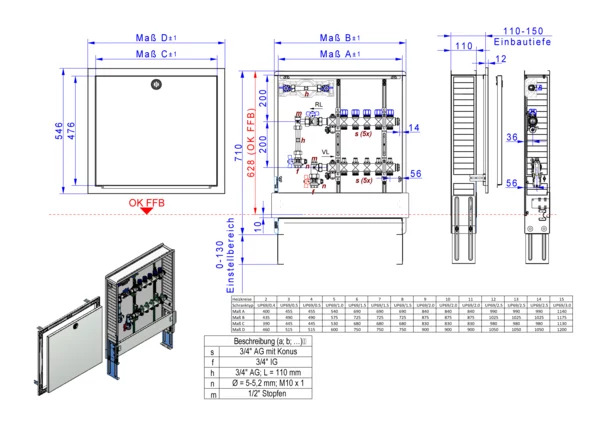 Die Anschlussstation für Flächenheizung und -kühlung ist im Unterputzschrank montiert und umfasst einen Edelstahlverteiler mit integrierten Regulierventilen und Ventileinsätzen (M30x1,5), sowie eine vertikale Anschlussgarnitur mit Wärmezählerverrohrung. Zusätzlich ist eine Wasserzählereinbaustrecke für Trinkwasser kalt vorhanden. Es gibt Platzhaltungen für Stellantriebe.