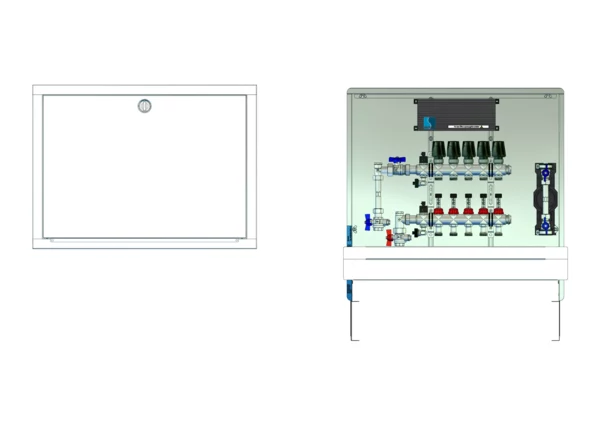 vertikale Anschlussgarnitur mit Wärmezählerverohrung, Verteiler mit Durchflussanzeiger 0-3 l/min im Vorlaufbalken und Thermostatventileinsatz M30x1,5 im Rücklaufbalken, vormontierte Stellantriebe und Klemmleiste mit Vorverdrahtung, Wasserzählerstrecke Trinkwasser kalt, Standard-Unterputz-Schrank mit Frontblende in RAL 9016