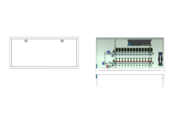 vertikale Anschlussgarnitur mit Wärmezählerverohrung, Verteiler mit Durchflussanzeiger 0-3 l/min im Vorlaufbalken und Thermostatventileinsatz M30x1,5 im Rücklaufbalken, vormontierte Stellantriebe und Klemmleiste mit Vorverdrahtung, Wasserzählerstrecke Trinkwasser kalt, Standard-Unterputz-Schrank mit Frontblende in RAL 9016