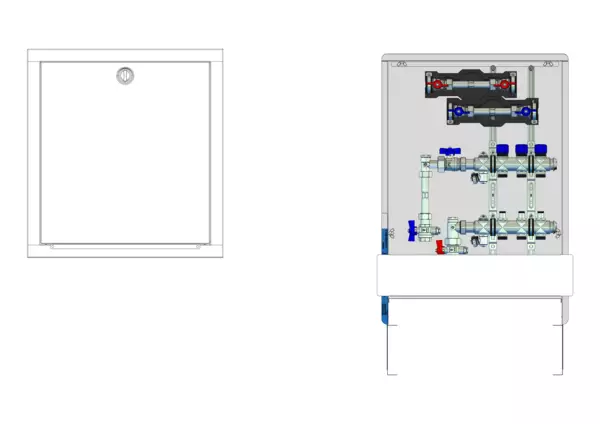 strawa FB-Anschlussstation H 53-W2-WMZ 3 Hkr.,BxHxT: 515x725x122 mm, vert. AG m. WMZ, Verteiler mit Regulierventil + THV M30x1,5, Wasserzählerstr. TW kalt und warm, Standard-UP-Schrank mit Frontblende in RAL 9016