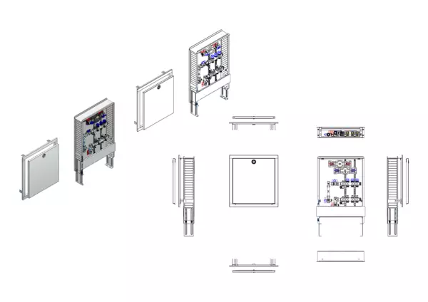 Die Anschlussstation für Flächenheizung und -kühlung ist im Unterputz-Schrank montiert und umfasst einen Edelstahlverteiler mit integrierten Regulierventilen und Ventileinsätzen (M30×1,5) sowie eine vertikale Anschlussgarnitur mit Wärmezählerverrohrung. Zusätzlich sind Wasserzählereinbaustrecken für Trinkwasser kalt und warm vorhanden. Es gibt Platzhaltungen für Stellantriebe.