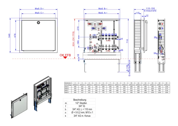 Die Anschlussstation für Flächenheizung und -kühlung ist im Unterputzschrank montiert und umfasst einen Edelstahlverteiler mit integrierten Regulierventilen und Ventileinsätzen (M30x1,5), sowie eine vertikale Anschlussgarnitur mit Wärmezählerverrohrung. Zusätzlich sind Wasserzählereinbaustrecken für Trinkwasser kalt und warm vorhanden. Es gibt Platzhaltung für Stellantriebe.