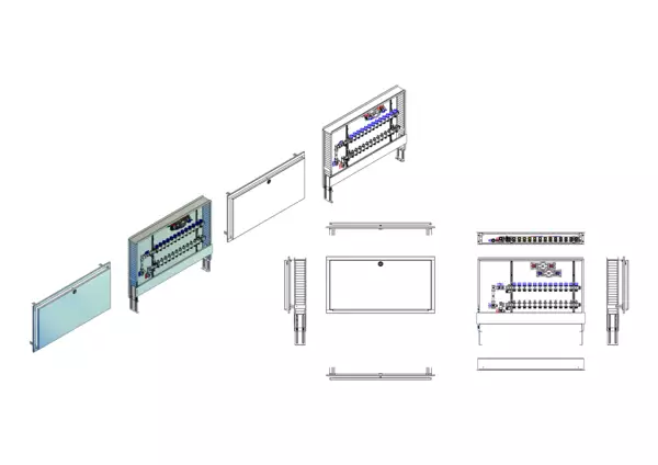 Die Anschlussstation für Flächenheizung und -kühlung ist im Unterputz-Schrank montiert und umfasst einen Edelstahlverteiler mit integrierten Regulierventilen und Ventileinsätzen (M30×1,5) sowie eine vertikale Anschlussgarnitur mit Wärmezählerverrohrung. Zusätzlich sind Wasserzählereinbaustrecken für Trinkwasser kalt und warm vorhanden. Es gibt Platzhaltungen für Stellantriebe.