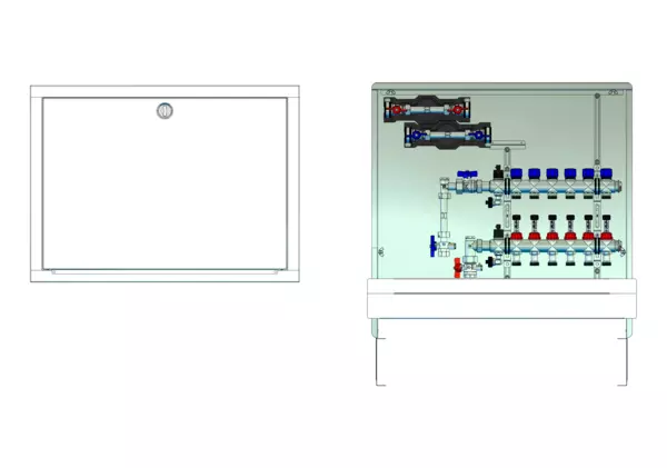 strawa FB-Anschlussstation H 63-W2-WMZ 6 Hkr.,BxHxT: 750x725x122 mm, vert. AG. m. WMZ, Verteiler m. DFA 0-3 l/min + THV M30x1,5, Wasserzählerstr. TW kalt und warm, Standard-Schrank m. Frontbl. in RAL 9016
