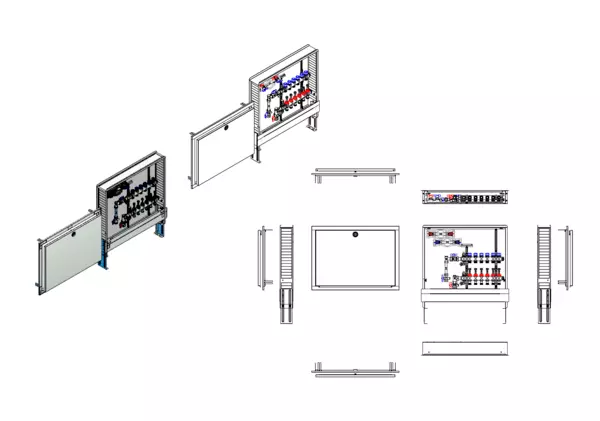 Die Anschlussstation für Flächenheizung und -kühlung ist im Unterputzschrank montiert und umfasst einen Edelstahlverteiler mit regulierbaren Durchflussanzeigern und Ventileinsätzen (M30x1,5), sowie eine vertikale Anschlussgarnitur mit Wärmezählerverrohrung. Zusätzlich sind Wasserzählereinbaustrecken für Trinkwasser kalt und warm vorhanden. Es gibt Platzhaltungen für Stellantriebe.