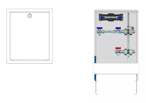 strawa HK-Anschlussstation H 52h-W1-WMZ 2 Hkr.,BxHxT: 460x725x122 mm, horiz. AG m. WMZ, Verteiler ohne Einbauten, Wasserzählerstr. TW kalt, Standard-UP-Schrank mit Frontblende in RAL 9016