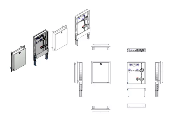 horizontale Anschlussgarnitur mit Wärmezählerverrohrung, Verteiler ohne Einbauten, Wasserzählerstrecke Trinkwasser kalt, Standard-Unterputz-Schrank mit Frontblende in RAL 9016