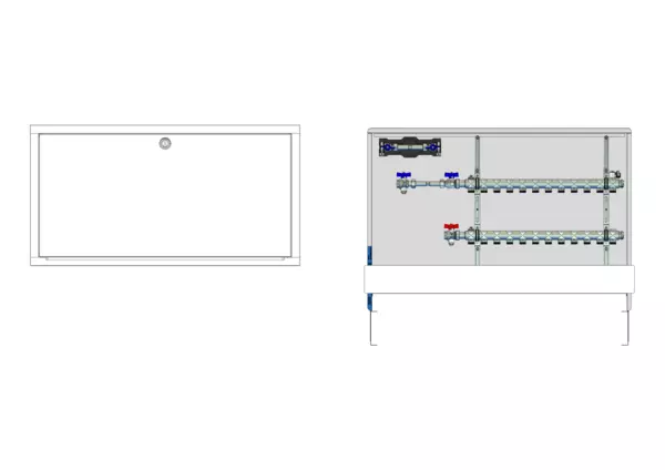 horizontale Anschlussgarnitur mit Wärmezählerverrohrung, Verteiler ohne Einbauten, Wasserzählerstrecke Trinkwasser kalt, Standard-Unterputz-Schrank mit Frontblende in RAL 9016