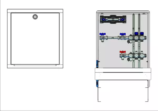 strawa FB-Anschlussstation H 53h-W1-WMZ 2 Hkr.,BxHxT: 515x725x122 mm, horiz. AG m. WMZ, Verteiler mit Regulierventil + THV M30x1,5, Wasserzählerstr. TW kalt, Standard-UP-Schrank mit Frontblende in RAL 9016