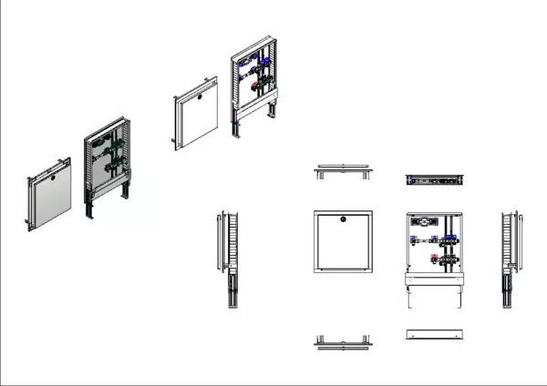 Die Anschlussstation für Flächenheizung und -kühlung ist im Unterputzschrank montiert und umfasst einen Edelstahlverteiler mit integrierten Regulierventilen und Ventileinsätzen (M30x1,5), sowie eine horizontale Anschlussgarnitur mit Wärmezählerverrohrung. Zusätzlich ist eine Wasserzählereinbaustrecke für Trinkwasser kalt vorhanden. Es gibt Platzhaltungen für Stellantriebe.