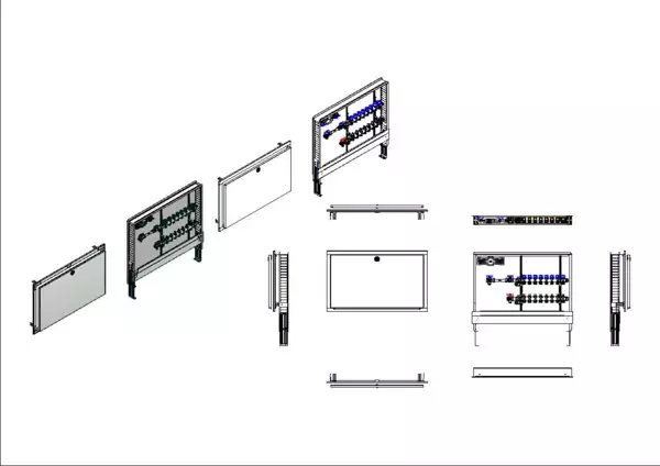 Die Anschlussstation für Flächenheizung und -kühlung ist im Unterputzschrank montiert und umfasst einen Edelstahlverteiler mit integrierten Regulierventilen und Ventileinsätzen (M30x1,5), sowie eine horizontale Anschlussgarnitur mit Wärmezählerverrohrung. Zusätzlich ist eine Wasserzählereinbaustrecke für Trinkwasser kalt vorhanden. Es gibt Platzhaltungen für Stellantriebe.
