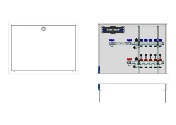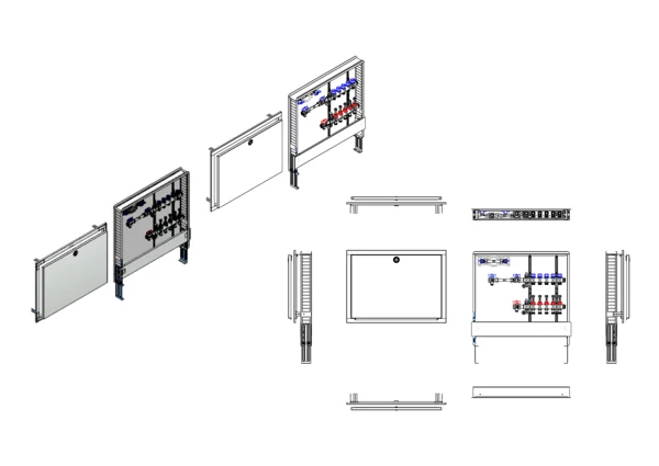Die Anschlussstation für Flächenheizung und -kühlung ist im Unterputzschrank montiert und umfasst einen Edelstahlverteiler mit regulierbaren Durchflussanzeigern und Ventileinsätzen (M30x1,5), sowie eine horizontale Anschlussgarnitur mit Wärmezählerverrohrung. Zusätzlich ist eine Wasserzählereinbaustrecke für Trinkwasser kalt vorhanden. Es gibt Platzhaltungen für Stellantriebe.