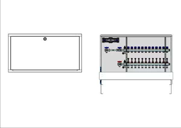 Die Anschlussstation für Flächenheizung und -kühlung ist im Unterputzschrank montiert und umfasst einen Edelstahlverteiler mit regulierbaren Durchflussanzeigern und Ventileinsätzen (M30x1,5), sowie eine horizontale Anschlussgarnitur mit Wärmezählerverrohrung. Zusätzlich ist eine Wasserzählereinbaustrecke für Trinkwasser kalt vorhanden. Es gibt Platzhaltungen für Stellantriebe.