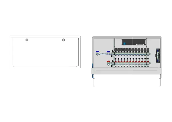 horizontale Anschlussgarnitur mit Wärmezählerverohrung, Verteiler mit Durchflussanzeiger 0-3 l/min im Vorlaufbalken und Thermostatventileinsatz M30x1,5 im Rücklaufbalken, mit vormontierten Stellantrieben und Klemmleiste mit Vorverdrahtung, Wasserzählerstrecke Trinkwasser kalt, Standard-Schrank mit Frontblende in RAL 9016