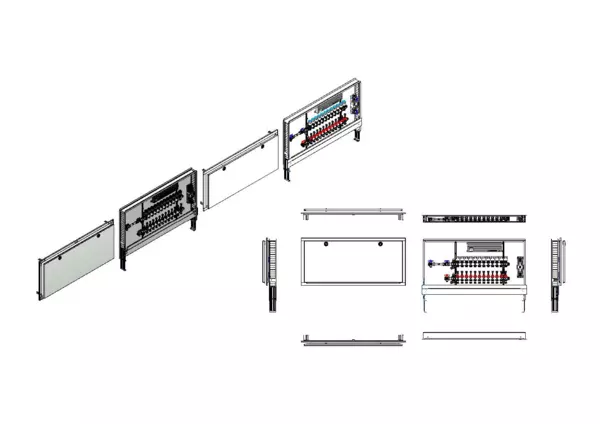 Die Anschlussstation für Flächenheizung ist im Unterputzschrank montiert und umfasst einen Edelstahlverteiler mit regulierbaren Durchflussanzeigern und Ventileinsätzen (M30x1,5), sowie eine horizontale Anschlussgarnitur mit Wärmezählerverrohrung. Zusätzlich ist eine Wasserzählereinbaustrecke für Trinkwasser kalt vorhanden. Die vormontierten und verdrahteten Stellantriebe sind auf einer montierten Klemmleiste installiert.