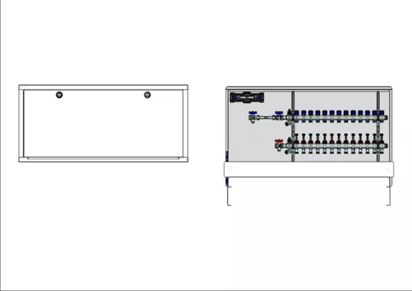 Die Anschlussstation für Flächenheizung und -kühlung ist im Unterputzschrank montiert und umfasst einen Edelstahlverteiler mit regulierbaren Durchflussanzeigern und Ventileinsätzen (M30x1,5), sowie eine horizontale Anschlussgarnitur mit Wärmezählerverrohrung. Zusätzlich ist eine Wasserzählereinbaustrecke für Trinkwasser kalt vorhanden. Es gibt Platzhaltungen für Stellantriebe.
