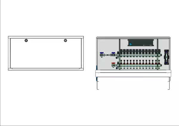 horizontale Anschlussgarnitur mit Wärmezählerverohrung, Verteiler mit Durchflussanzeiger 0-3 l/min im Vorlaufbalken und Thermostatventileinsatz M30x1,5 im Rücklaufbalken, mit vormontierten Stellantrieben und Klemmleiste mit Vorverdrahtung, Wasserzählerstrecke Trinkwasser kalt, Standard-Schrank mit Frontblende in RAL 9016