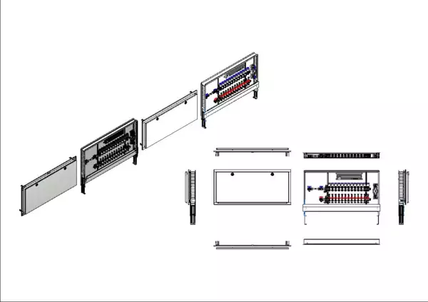Die Anschlussstation für Flächenheizung ist im Unterputzschrank montiert und umfasst einen Edelstahlverteiler mit regulierbaren Durchflussanzeigern und Ventileinsätzen (M30x1,5), sowie eine horizontale Anschlussgarnitur mit Wärmezählerverrohrung. Zusätzlich ist eine Wasserzählereinbaustrecke für Trinkwasser kalt vorhanden. Die vormontierten und verdrahteten Stellantriebe sind auf einer montierten Klemmleiste installiert.