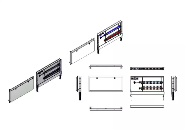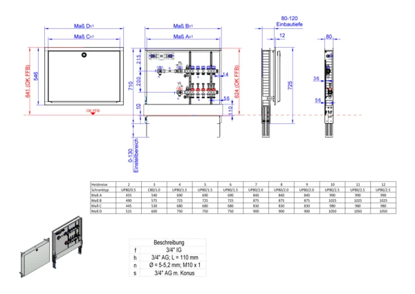 Die Anschlussstation für Flächenheizung und -kühlung ist im Unterputzschrank montiert und umfasst einen Edelstahlverteiler mit regulierbaren Durchflussanzeigern und Ventileinsätzen (M30x1,5), sowie eine horizontale Anschlussgarnitur mit Wärmezählerverrohrung. Zusätzlich ist eine Wasserzählereinbaustrecke für Trinkwasser kalt vorhanden. Es gibt Platzhaltungen für Stellantriebe.